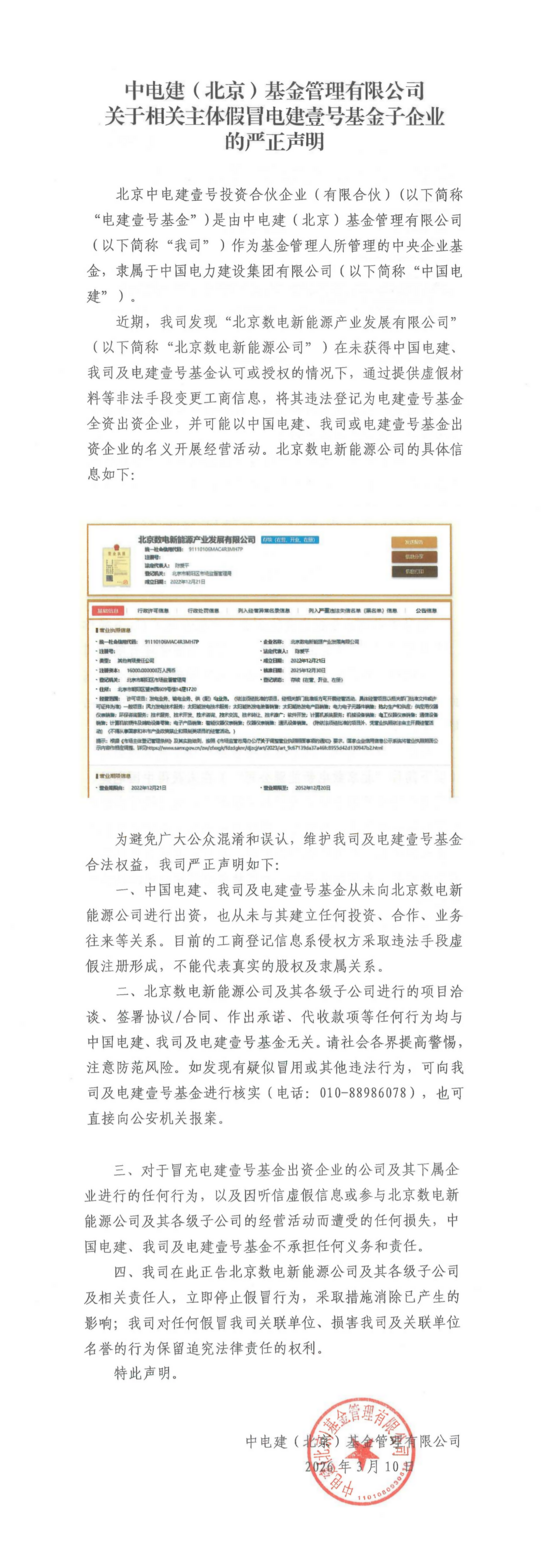 北京中电建壹号投资合伙企业(有限合伙)(以下简称“电建壹号基金”)是由中电建(北京)基金管理有限公司(以下简称“我司”)作为基金管理人所管理的中央企业基金,隶属于中国电力建设集团有限公司(以下简称“中国电建”)。 近期,我司发现“北京数电新能源产业发展有限公司”(以下简称“北京数电新能源公司”)在未获得中国电建、我司及电建壹号基金认可或授权的情况下,通过提供虚假材料等非法手段变更工商信息,将其违法登记为电建壹号基金全资出资企业,并可能以中国电建、我司或电建壹号基金出资企业的名义开展经营活动。北京数电新能源公司的具体信息如下: 为避免广大公众混淆和误认,维护我司及电建壹号基金合法权益,我司严正声明如下: 一、中国电建、我司及电建壹号基金从未向北京数电新能源公司进行出资,也从未与其建立任何投资、合作、业务往来等关系。目前的工商登记信息系侵权方采取违法手段虚假注册形成,不能代表真实的股权及隶属关系。 二、北京数电新能源公司及其各级子公司进行的项目洽谈、签署协议/合同、作出承诺、代收款项等任何行为均与中国电建、我司及电建壹号基金无关。请社会各界提高警惕,注意防范风险。如发现有疑似冒用或其他违法行为,可向我司及电建壹号基金进行核实(电话:010-88986078),也可直接向公安机关报案。 三、对于冒充电建壹号基金出资企业的公司及其下属企业进行的任何行为,以及因听信虚假信息或参与北京数电新能源公司及其各级子公司的经营活动而遭受的任何损失,中国电建、我司及电建壹号基金不承担任何义务和责任。 四、我司在此正告北京数电新能源公司及其各级子公司及相关责任人,立即停止假冒行为,采取措施消除已产生的影响;我司对任何假冒我司关联单位、损害我司及关联单位名誉的行为保留追究法律责任的权利。 特此声明。 中电建(北京)基金管理有限公司 2026年3月10日 |